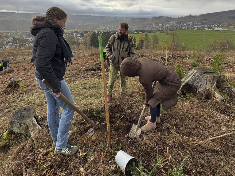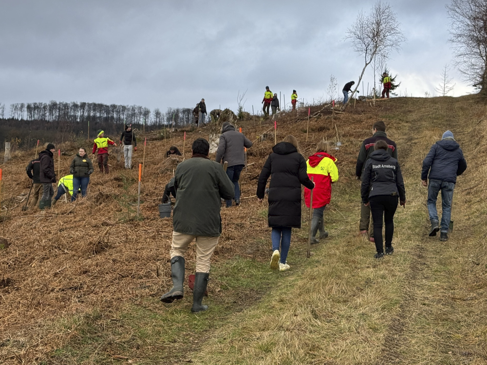 Der Tag begann am Festplatz „Im Siepen“ in Arnsberg-Oeventrop. Hier griffen die Teilnehmer selbst zum Spaten und pflanzten im neu angelegten Arboretum der Stadt Arnsberg Bäume, die Hoffnung geben: Küstenmammutbäume, Tulpenbäume, Baumhasel und Lindenblättrige Birken. Diese Vielfalt soll zeigen, ob Baumarten aus anderen Klimaregionen künftig auch in unserer Heimat gedeihen können.