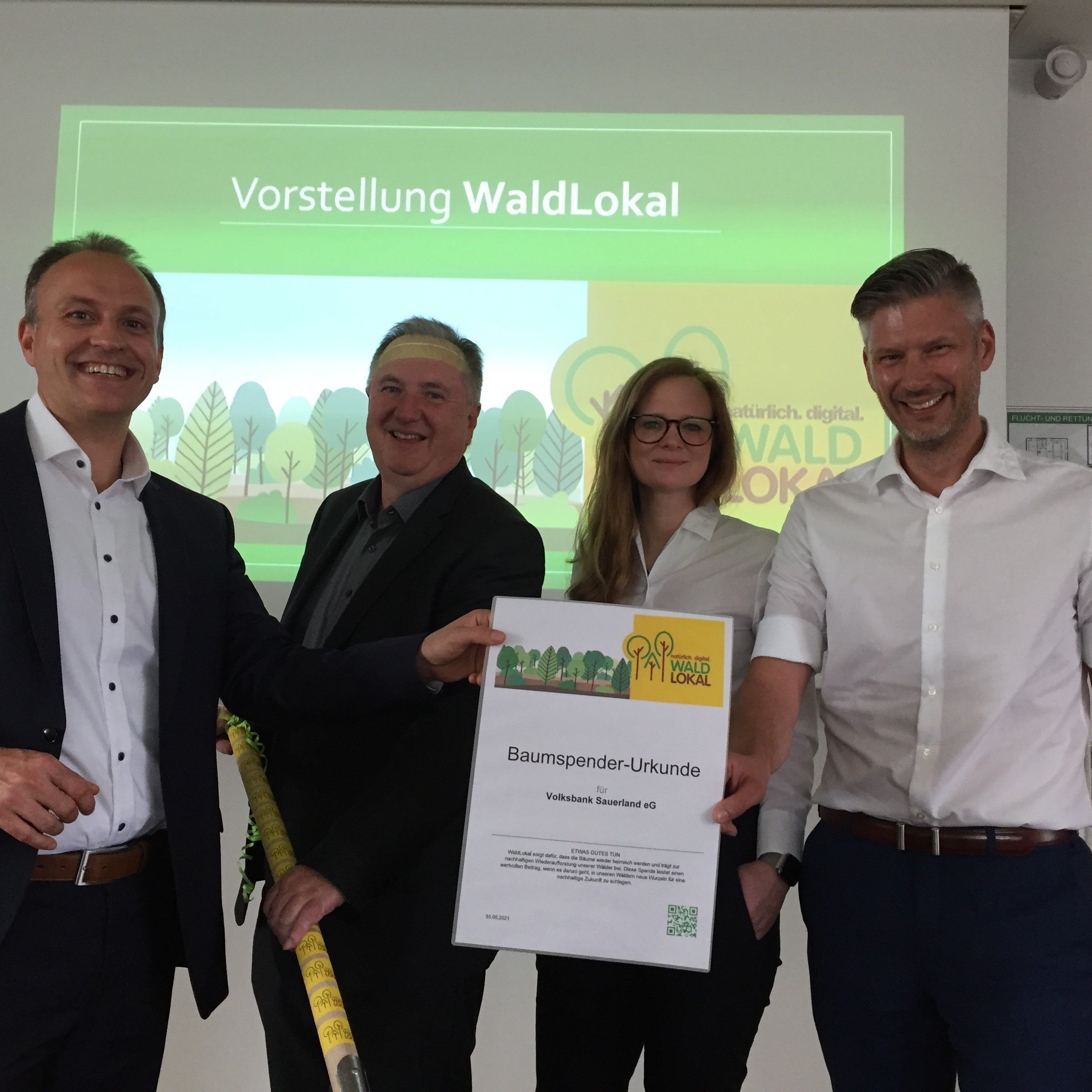 „Alleine bist Du ein Baum, gemeinsam sind wir ein Wald“ mit diesen Worten gab Dr. Florian Müller, Vorstandsmitglied der Volksbank Sauerland, die Partnerschaft mit der WaldLokal gGmbH bekannt. Die größte Genossenschaftsbank im Hochsauerland-kreis hat die verheerende Situation des Sauerländer Waldes zum Anlass genommen und möchte mithelfen, den Wald in der touristischen Region mit ihren vielen Erholungs-gebieten wieder aufblühen zu lassen. Dafür wurde für die vier Städte und eine Gemein-de im Geschäftsgebiet (Arnsberg, Sundern, Meschede, Bestwig und Olsberg) jeweils eine WaldLokal-Schirmherrschaft mit den Geschäftsführern der WaldLokal gGmbH, Andrea Tigges und Mario Ernst, vereinbart.